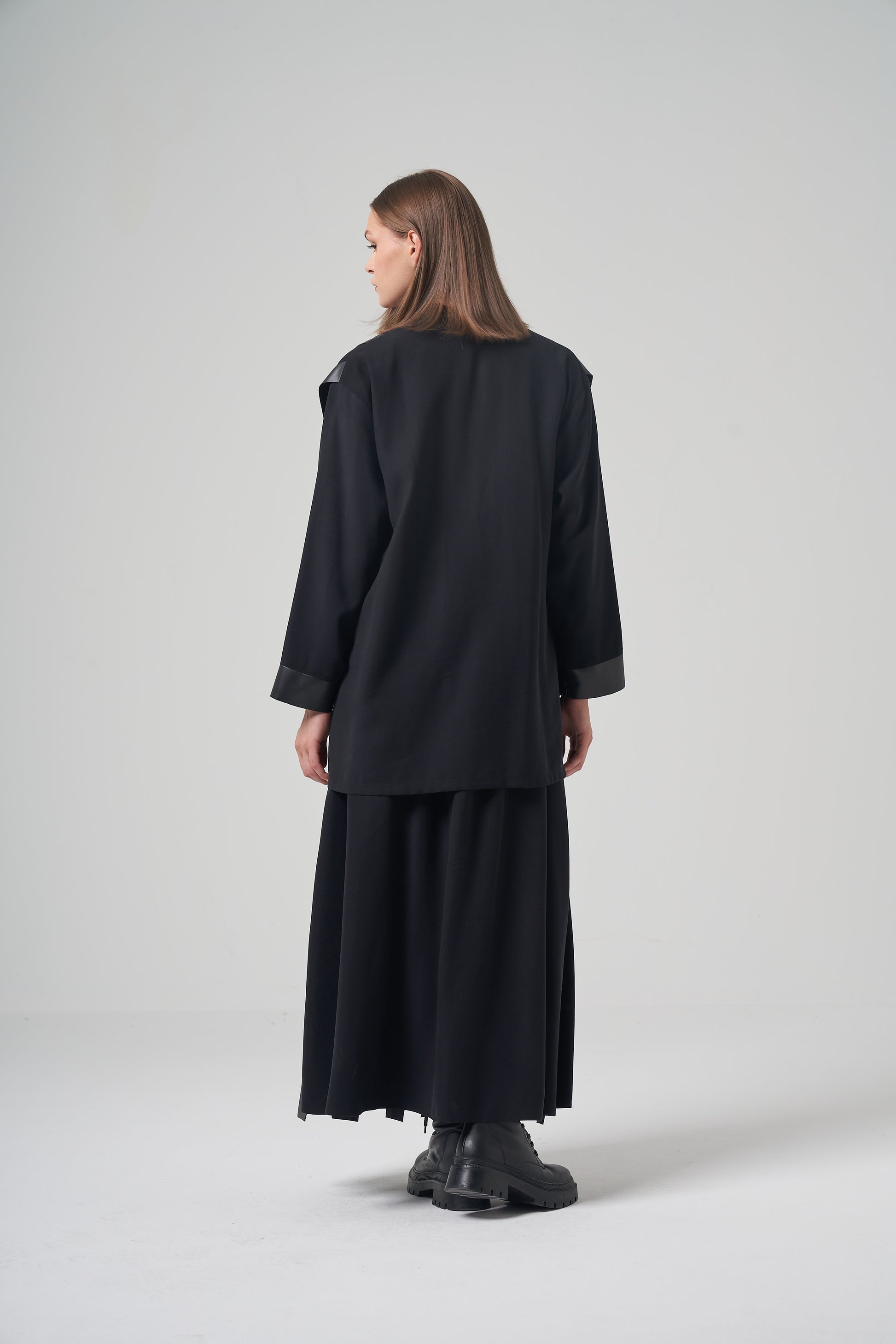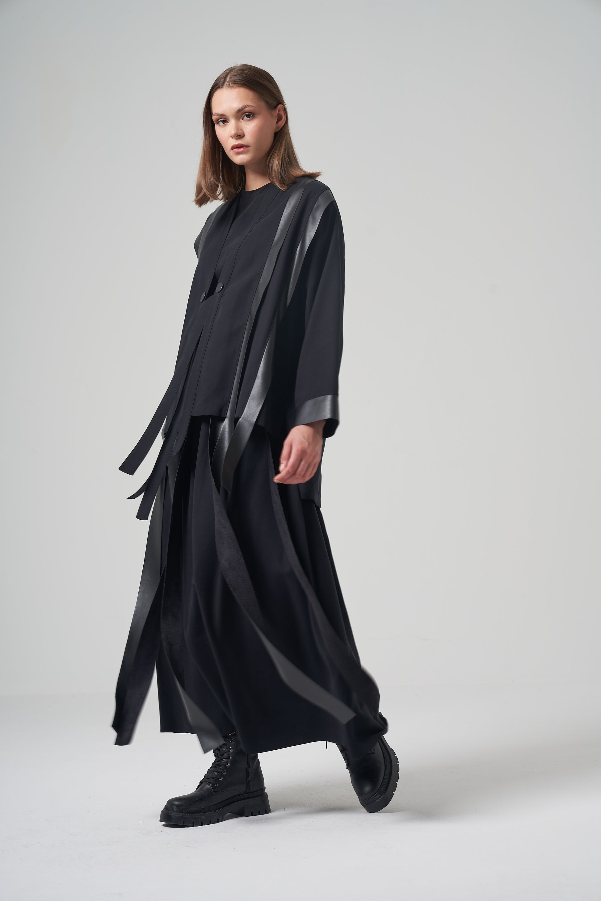Designed for movement. This avant-garde set features a soft black cardigan and matching skirt, both embellished with long, vertical strips of faux leather. These wide "fringes" sway with every step, creating a dynamic visual effect. Finished with leather-trimmed cuffs and a two-button closure for a polished look.