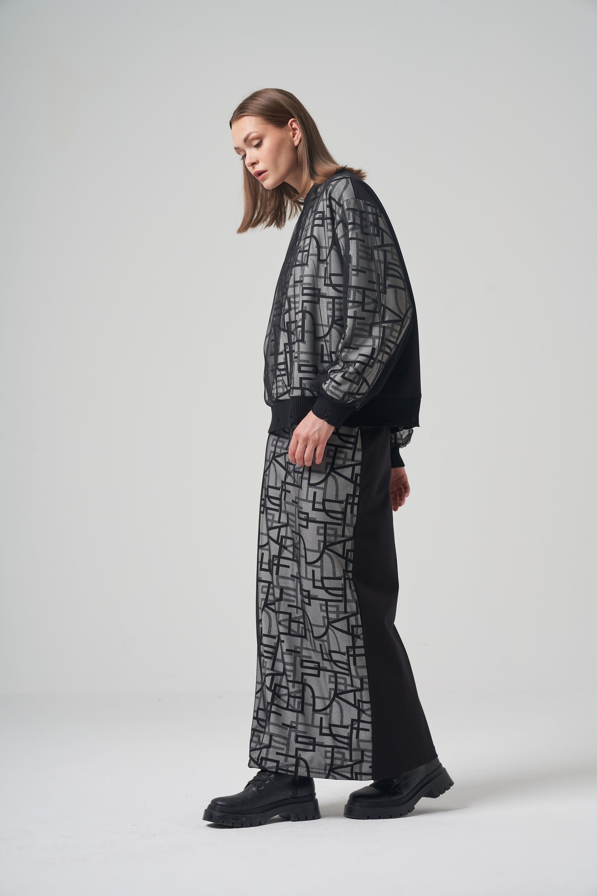 Graphic impact meets modern transparency. This two-piece set features a grey and black geometric pattern on a semi-sheer mesh overlay. The top highlights sheer sleeves that showcase the intricate design, while the matching maxi skirt continues the visual flow. Grounded by solid black back panels, it creates a striking look from every angle.