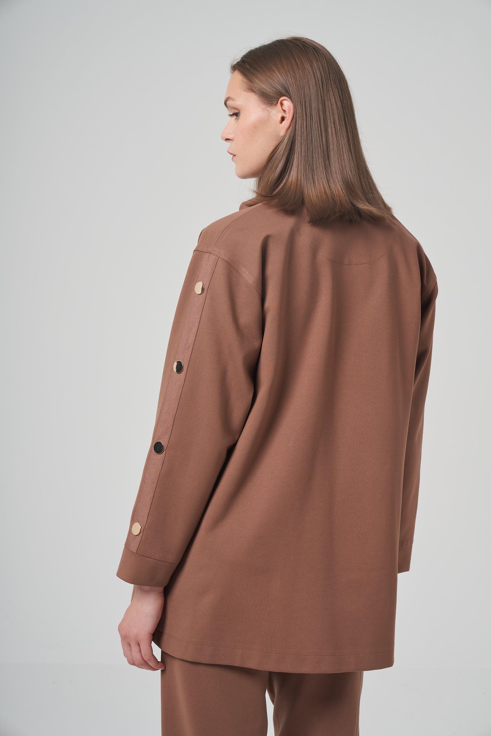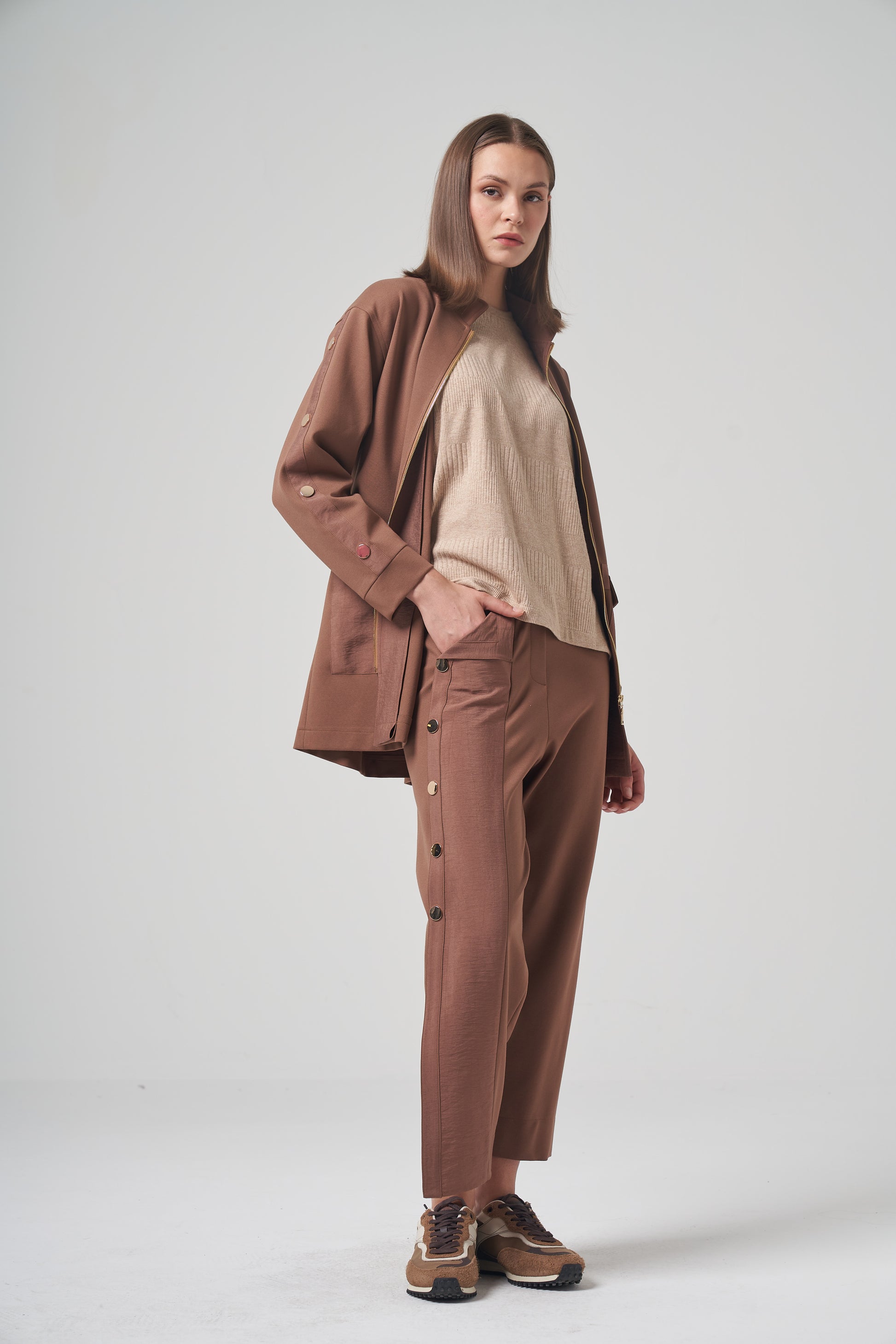 Functional luxury reimagined. This tobacco-hued set merges utility with high-end detailing. The standout features are the gold snap buttons running down the sleeves and trouser legs, offering a customizable silhouette. Whether worn closed for a streamlined look or unbuttoned for movement, it represents the pinnacle of modern adaptability.