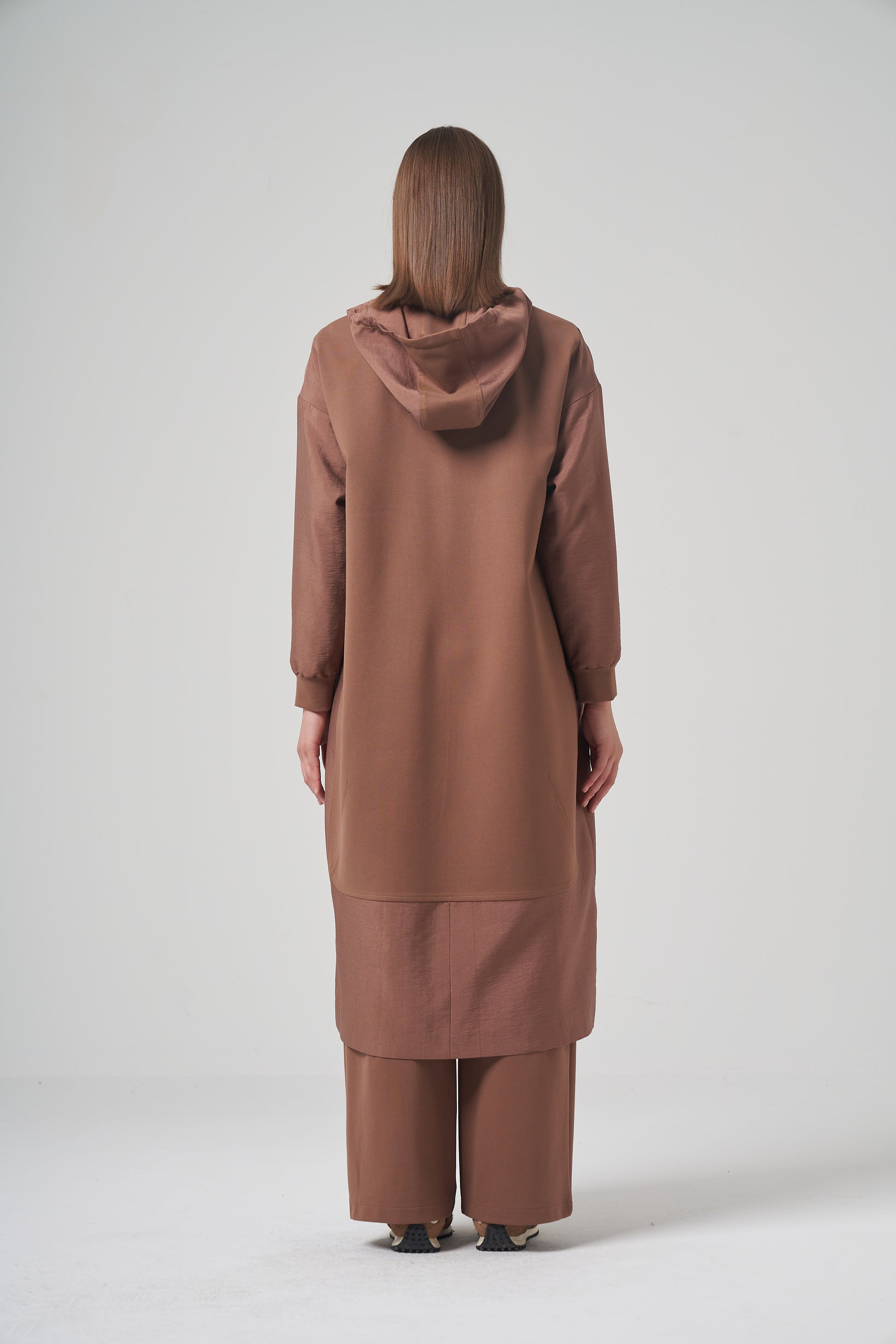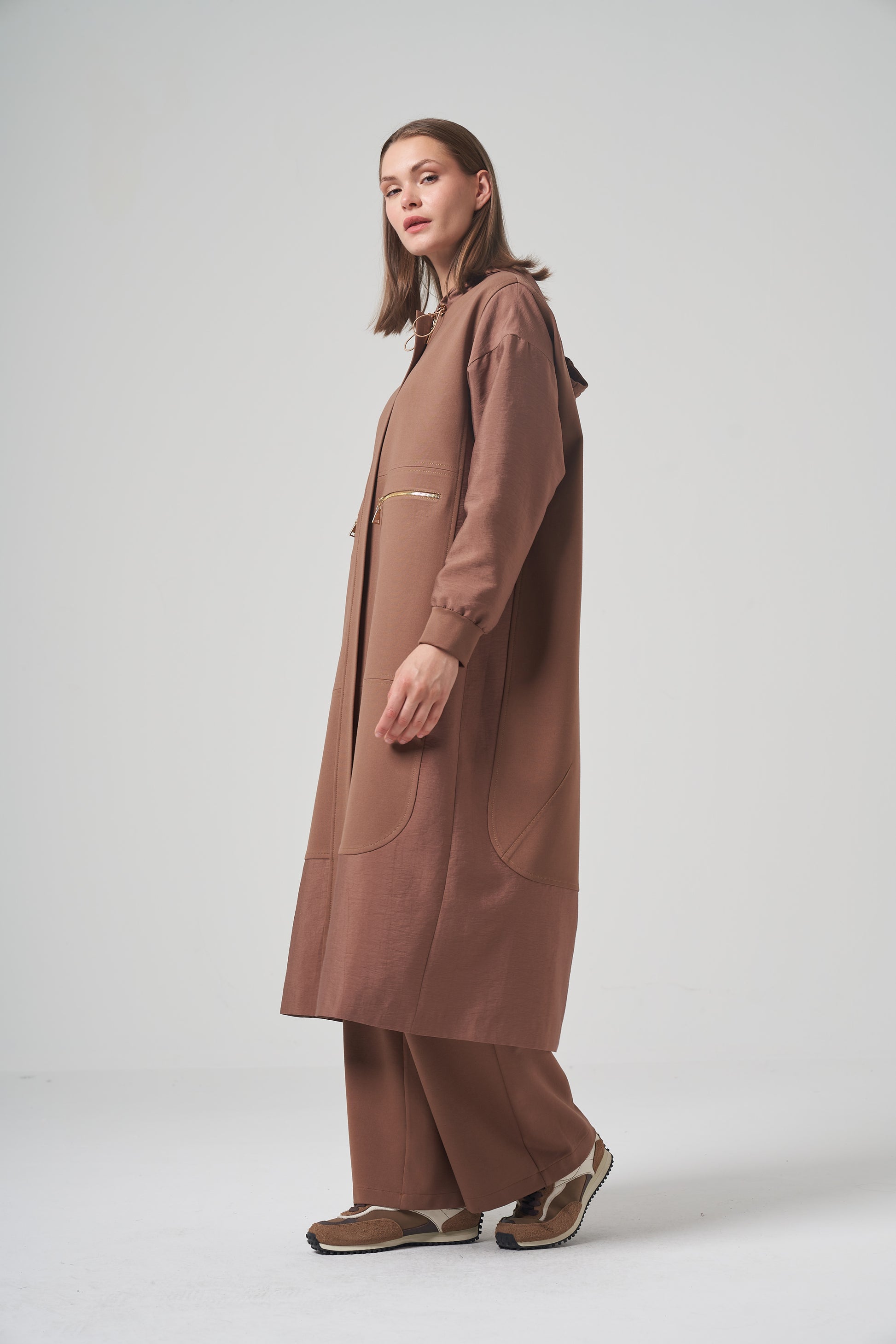 Urban protection meets high-end design. This earth-toned ensemble centers around a floor-sweeping hooded coat that acts as a sophisticated shield against the city. Defined by horizontal gold zippers that punctuate the chest, it offers a utilitarian yet luxurious aesthetic. Paired with matching wide-leg trousers, it creates an elongated, powerful silhouette.