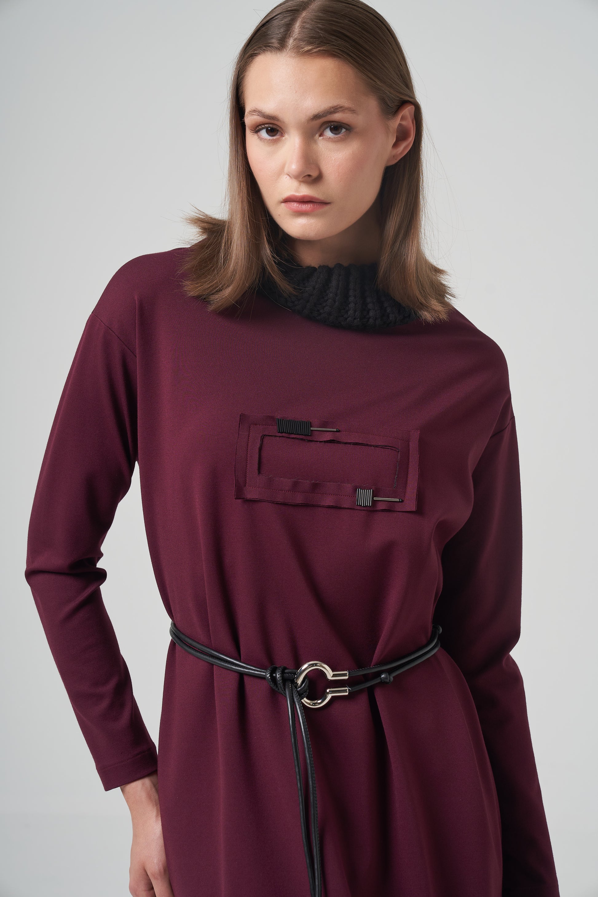Subversive elegance. This deep burgundy gown challenges traditional evening wear with industrial accents. The raw-edged chest patch, fastened with signature safety pins, acts as a badge of modern rebellion. Grounded by a chunky black knit collar and a functional side zipper, it’s a masterclass in grunge-luxe aesthetics.