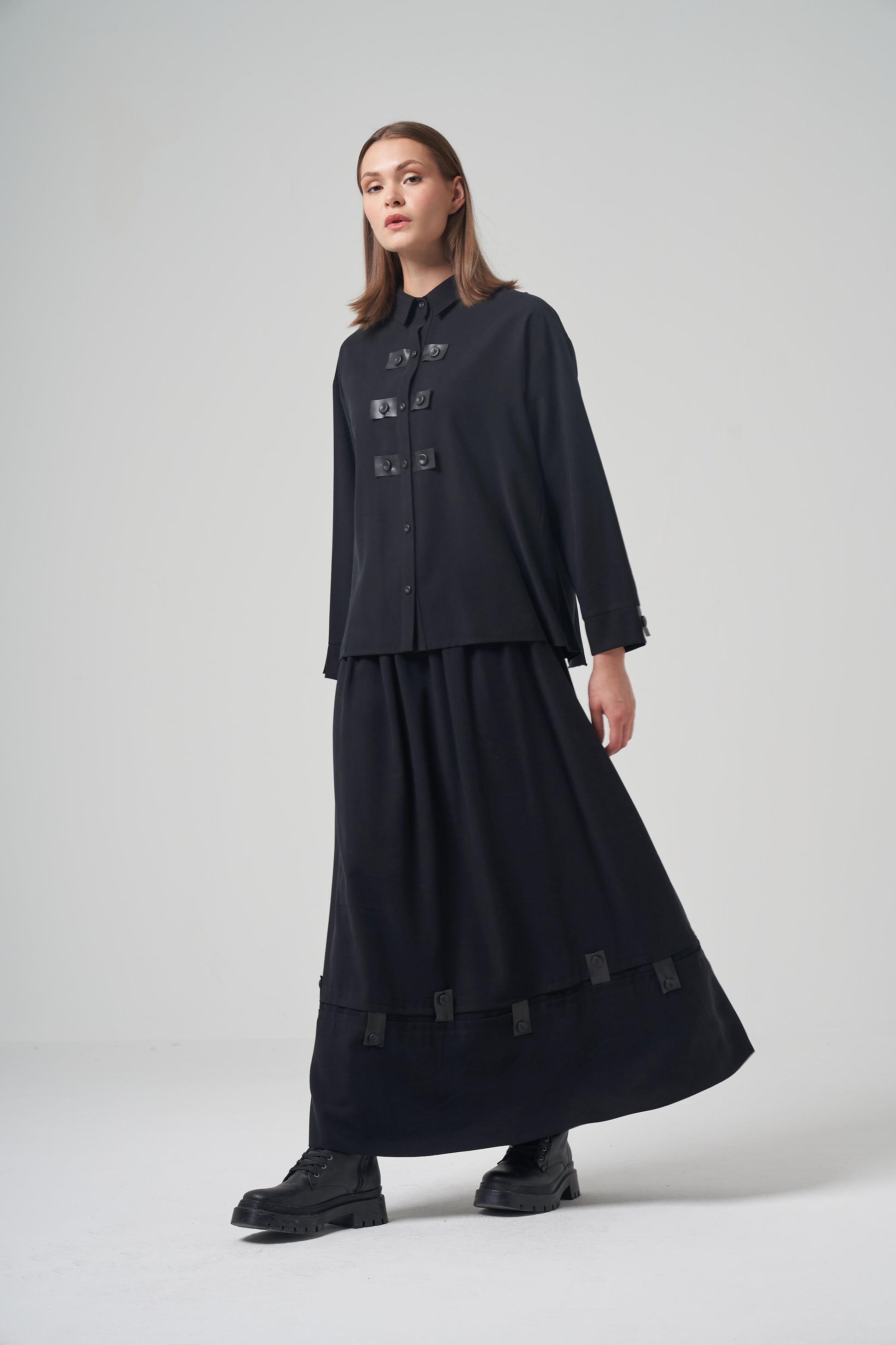 A new kind of power suit. Elevate your daily rotation with this detailed black set. The shirt’s collar and cuffs are punctuated by distinct button tabs, while the skirt’s panelled design adds weight and flow. A confident choice that bridges the gap between office wear and avant-garde fashion.