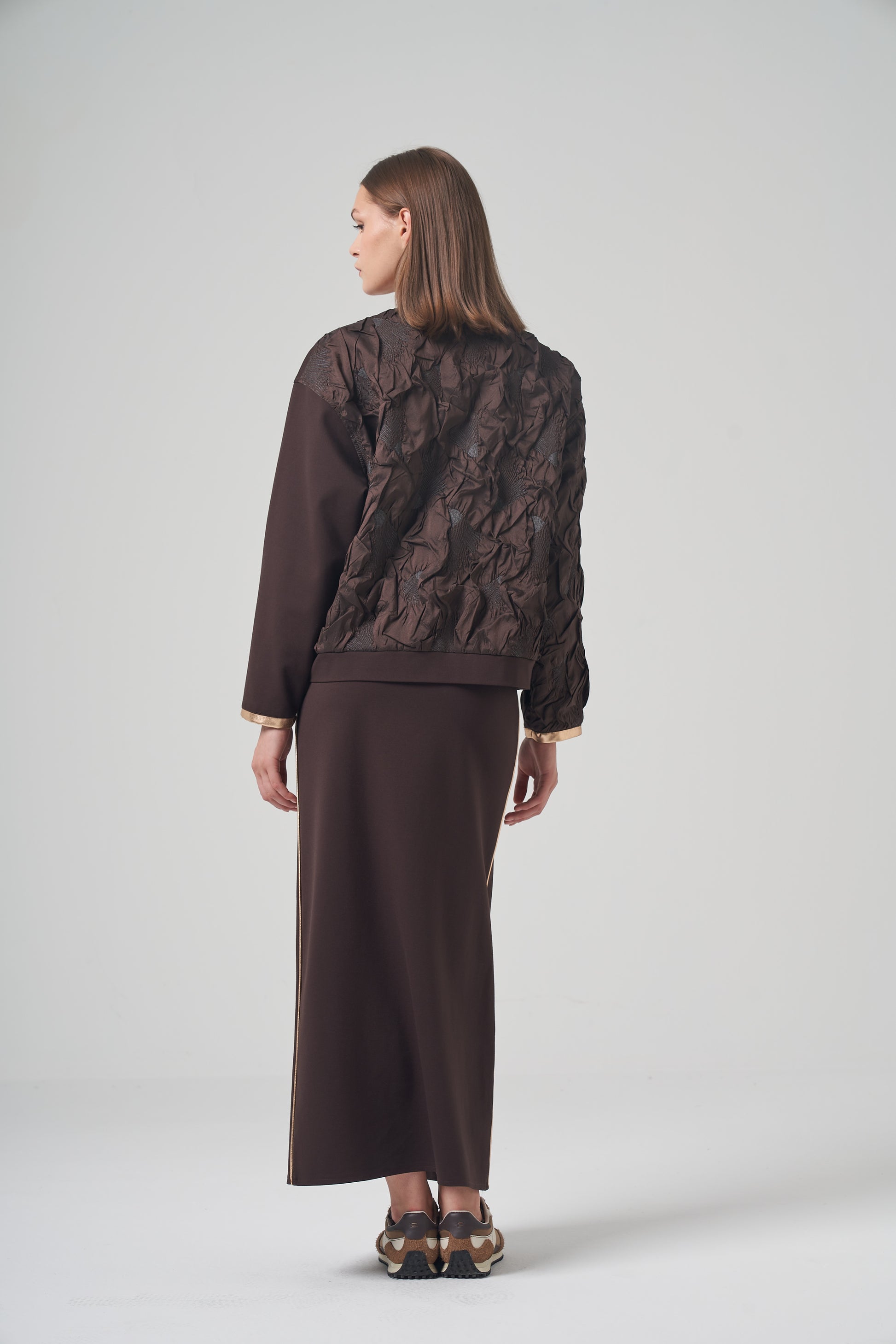 Athleisure reimagined for the sophisticated woman. Luxe Bomber Skirt Duo combines a relaxed fit with premium detailing. The zip-up jacket serves as a statement piece with its mixed textures, while the long, fluid skirt elongates the body. Finished with metallic gold piping that catches the light, this coordinate is perfect for those who refuse to compromise on style or comfort.