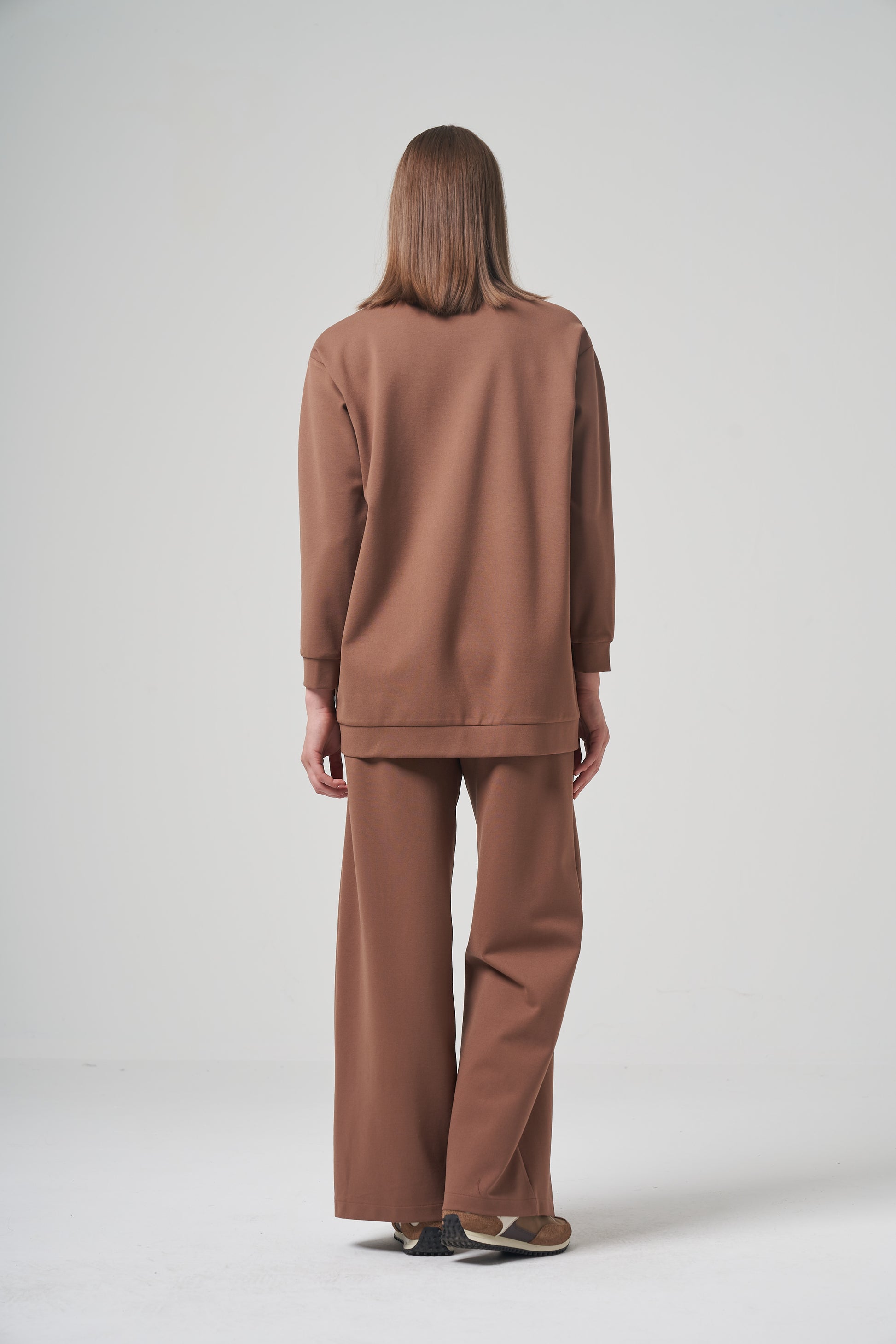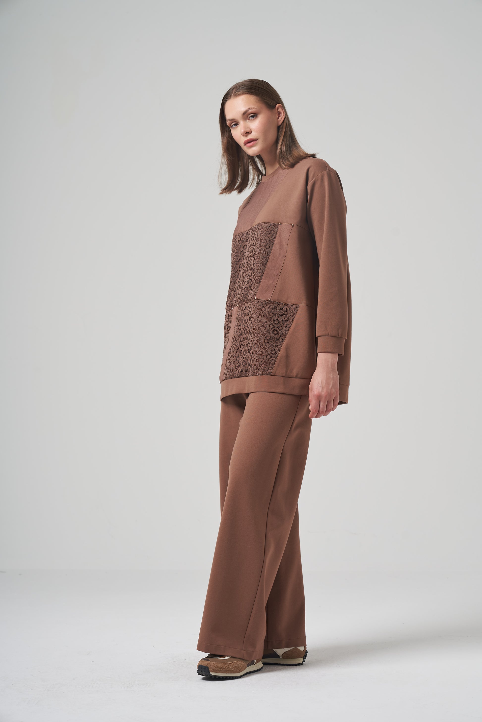 A study in tactile luxury. This rich mocha ensemble transforms the humble sweatshirt with intricate mixed-media detailing. The front panel is a sophisticated collage of matte jersey, lustrous satin, and textured lace, held together by delicate metallic studs. Paired with fluid wide-leg trousers, it creates a monochrome look with depth and character.