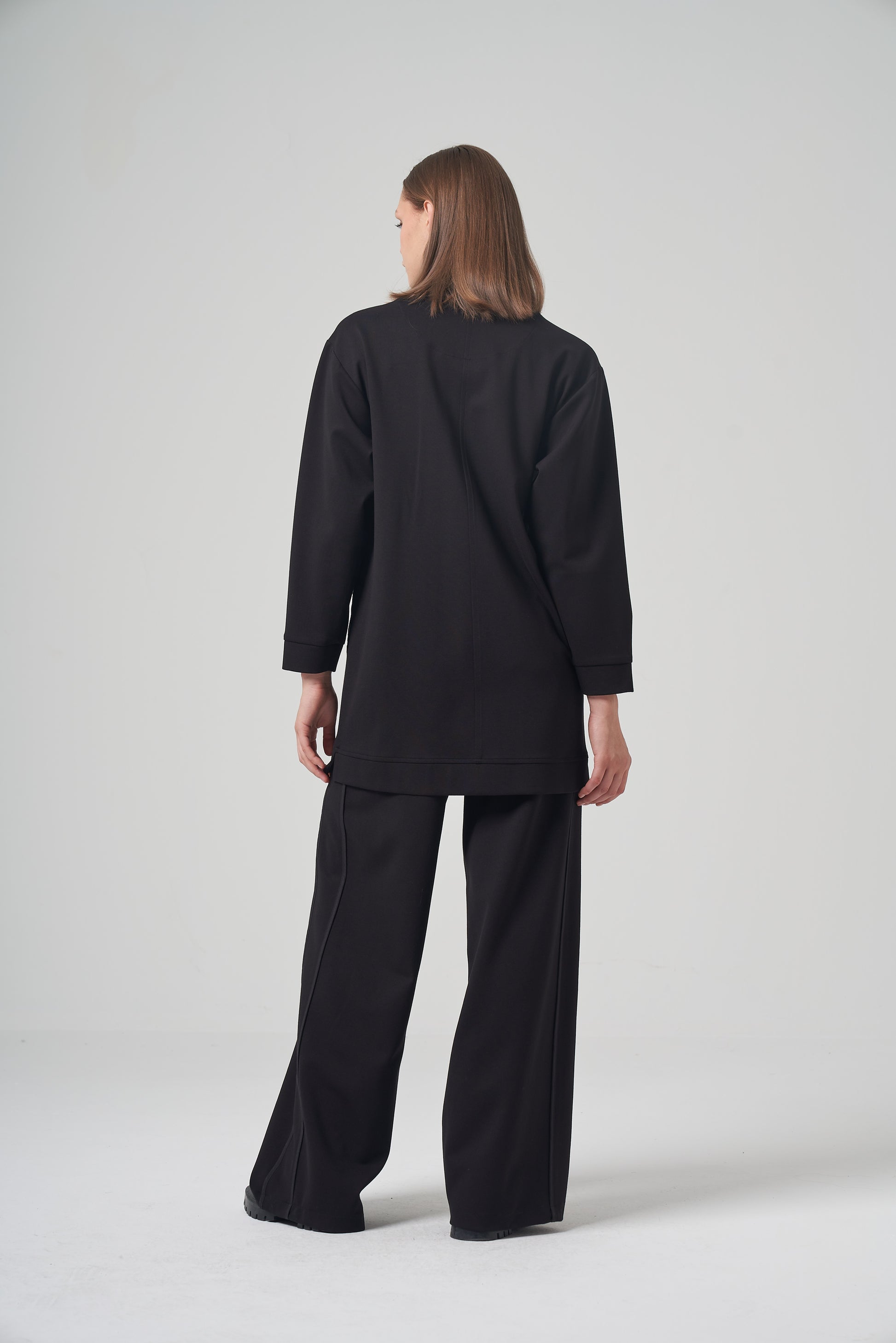 Sleek, sophisticated, and sharp. The high stand collar gives this tunic a regal air, grounded by the industrial edge of an exposed metal zipper. Paired with tailored wide-leg trousers featuring elongating front seams, it’s a contemporary uniform for the woman who means business but refuses boring suits.